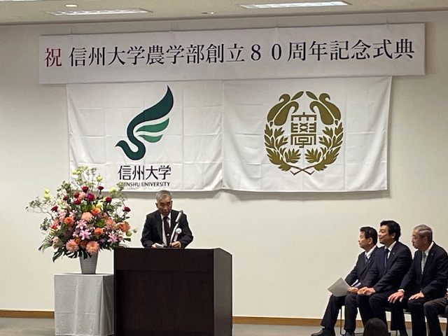 本日は創立80周年記念にご来場いただいた学長並びに来賓・同窓会員の皆さんありがとうございます。前身の長野県立農林専門学校が昭和20年2月に創立され、4月に伊那商業学校で入学式を行い、昭和24年に信州大学に昇格しました。現在農学部の卒業生は、学部卒 約11000名、修士卒 2500名,博士卒 約100名で計11900名です。